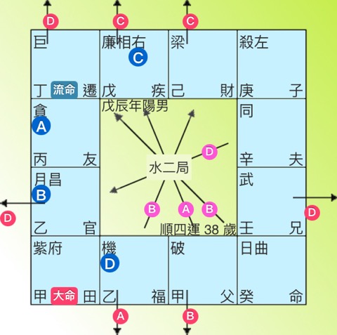 唯一可惜的是,遷移宮與兄弟宮的自化忌,影響十分大,尤其遷移宮是巨門自化忌,環境很黑暗!兄弟宮武曲自化忌,兄弟朋友之間的錢財糾紛、同時沖交友宮,與交友的化祿形成祿忌象,人際關係中,存在兇惡與高風險事件。