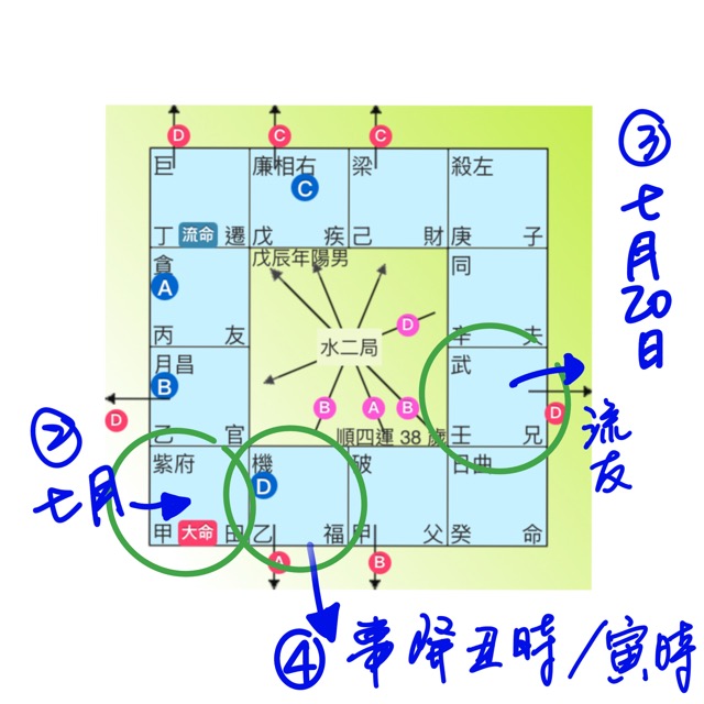 七月是大命沖流命的發射宮,二十日在流年交友、本命兄弟(在命理上的觀點,「外力介入」的事故可能性極高),至於時辰據說發生在凌晨,前面說到,自忌的承受是福德宮的天機化忌,所以福德宮為丑宮(丑時)就很有可能是事發時間點,而寅時是忌沖的發射宮,也是很有可能的。